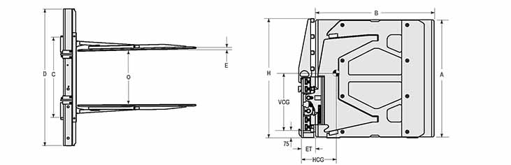 | Capacity 承載能力(kg) | Catalog Order NO 型號(hào) | Mounting Class 安裝等級(jí) | Load Center載荷中心(mm) | Opening Range張臂范圍(mm) | Arm Height臂高A(mm) | Arm Length臂長B(mm) | Arm Thickness臂厚E(mm) | Overall Width總寬D(mm) | Overall Height總高H(mm) | Vertcial Center Of Gravity垂直重心VCG(mm) | Hook Spread上鉤外側(cè)間距(mm) | Weight 自重(kg) | Effective 失載距ET(mm) | Horizontal Center of Gravity 水平重心CGH(mm) |