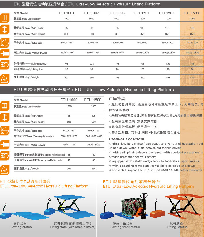 超低的自身高度,能適應(yīng)各種液壓搬運(yùn)車的上下,無需地坑,方便設(shè)備的移動(dòng);